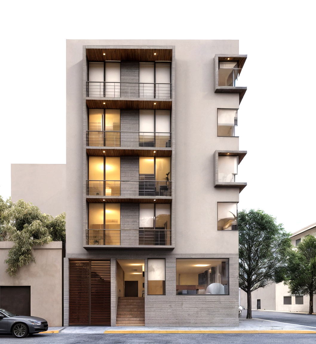 La propuesta se concibe como vivienda colectiva de cinco niveles con comercio en planta baja, un sótano de estacionamiento y veintidós departamentos destinados a familias de nivel medio. El concepto arquitectónico se centra en generar espacios funcionales y duraderos, con distribuciones óptimas que favorecen el confort cotidiano de sus habitantes.